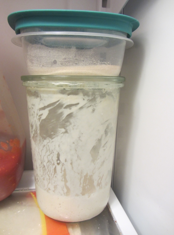As for the container – it became clear pretty quickly that straight sides are a good thing and a threaded jar is a bad thing. Straight sides because it’s much easier to get into and scrape down the jar when there’s no “neck”. Threads just gather crud and rapidly clog. I purchased a 6-pack of the Weck 743 jars and split it with a friend who was also making a new starter. (At the time the total cost was ~$6.50 per jar for six.) I use them without the gasket. They’re nice somewhat heavy jars made of thick glass. The lid just sits on top and it’s plenty secure.