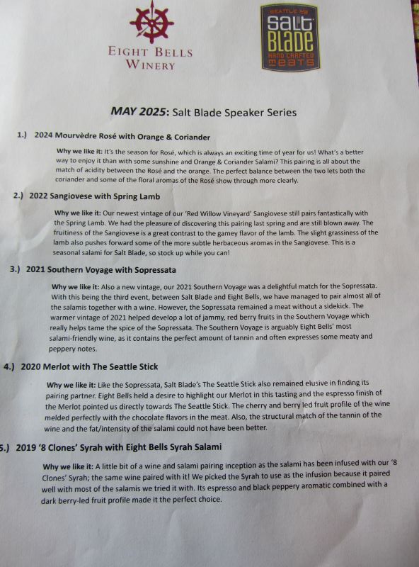 Eight Bells and Salt Blade have done pairing sessions before. Some of the pairings were repeats from past events. One of the new pairings was Sangiovese with the Spring Lamb, which we thought was perfect. The Merlot with the Seattle Stick was pretty flawless as well. I like spicy, so I especially enjoyed the Southern Voyage with Sopressata.