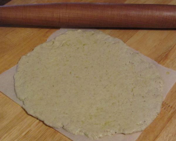 Oil the parchment and roll out the dough to 1/4″ thick. (picture below)