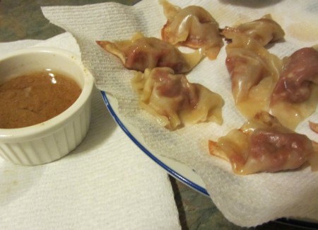 The cooking was standard potsticker technique: Preheat a non-stick skillet with a little canola oil. Add the dumplings and cook 3-4 minutes. Add 1/8 cup of water and quickly cover the pan, cook about 6 minutes covered. Uncover and cook about another 3 minutes until the bottoms of the potstickers are crispy.