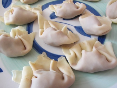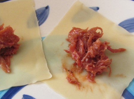 In keeping with the “excess” theme for Superbowl food, I thought it’d be fun to make an oddball dish (in addition to the Sizeable Pizza Bianca Sendup.) Something like Hum Bao. Or something like a pulled pork sandwich. Except that I wanted a crisp, crunchy, wonton wrapper instead of the typical Hum Bao steamed dough, or a floppy pulled pork hamburger bun.