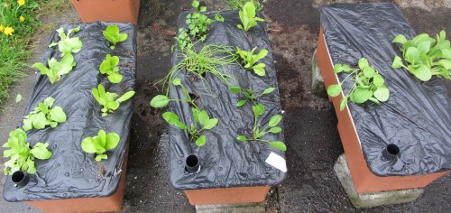Center Box: (left row, back to front) Parsley, Scallions, two Spinach. (right row) two Romaine, two Spinach