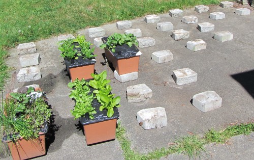 To step back for a moment, I laid out potential locations for the EarthBoxes on Friday. The two boxes in the foreground have casters, the left box has leftover stuff from two years ago and needs to be emptied and restocked. It’s 18 spots, of which 12 would get used: