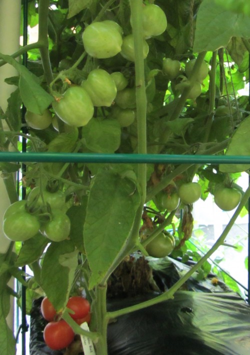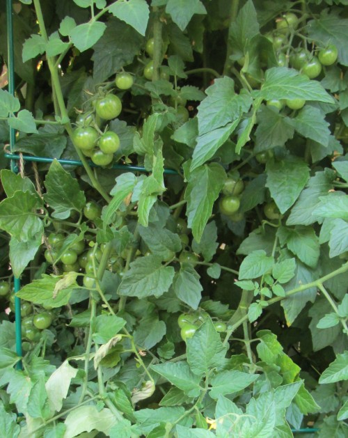 I pruned back the Brandywine tomato plant as well. The idea is that the plant take the energy and put it into the tomatoes, rather than new growth: