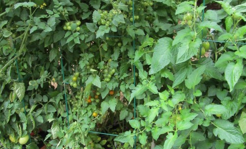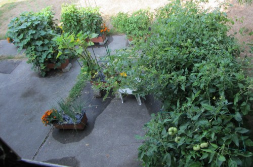 We conclude with something completely different. Those are Brandywine tomatoes in the foreground. I pruned back the center (Sun Gold) mass to try to give everyone else some light. The Sun Gold has leaves to spare anyway.