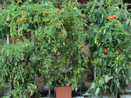 The tomatillos got pruned earlier in the week. Yesterday the tomatoes and cucumbers received the same treatment. I also trained the cucumber vines towards the “front” — the whole box has been leaning “back”: