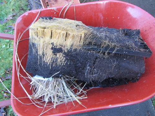 Yesterday was “Ready The EarthBoxes For Planting Day”. The EarthBox holding the lemongrass needed to be dumped upside down into a wheelbarrow because the roots had grown down through the base aeration screen and into the reservoir. The plant had to be cut off of the screen to get it out of the box: