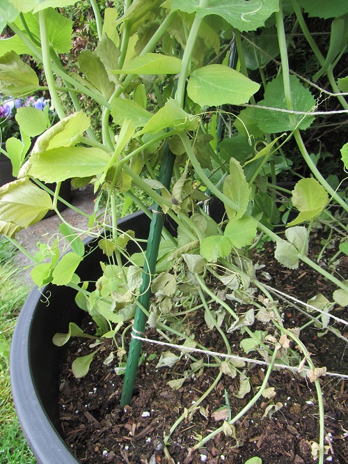 The leaves on the bottom have withered, and the leaves to to left higher up have turned yellow. I *think* it’s root rot, which is supposed to be caused by poor drainage/too much water. I think it’s interesting that the peas made it through a rainy February/March/April and chose now to crap out. If I’ve correctly identified the root rot then it’s now a race to see how many peas we get before the plants collapse.