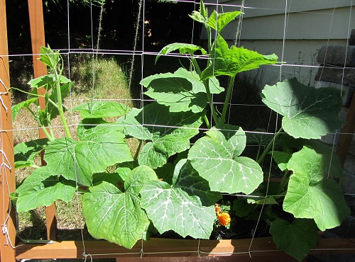 The Tromboncino zucchini are starting to latch onto the trellis: