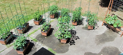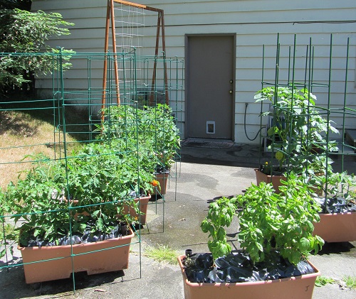 The basil and tomatoes, the tall plants on the back right are the tomatillos: