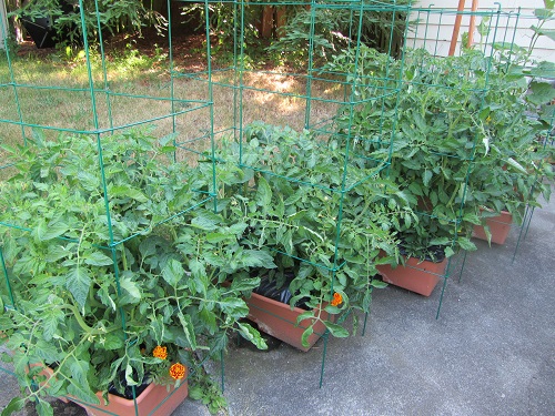 The tomatoes. The determinate varieties in the front two boxes are approaching maximum size, I think: