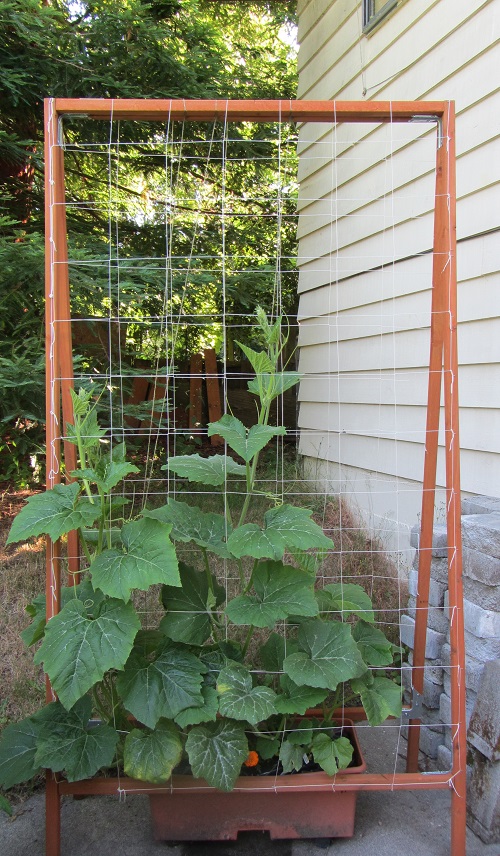 Cucumbers in the foreground. Tomatillos in the middle. Zucchini in the big trellis: