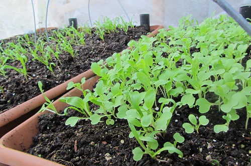Pak Choi in the right-hand box, interplanted with spinach. The box on the left is a mono-spinach box.