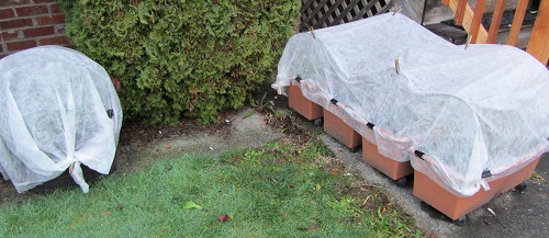 The remaining boxes under the deck have been rolled out to a more open location on the back patio. We’ll see how it all shakes out. Right now I’m thinking that the struggling boxes in the back yard will get interplanted with fast-growing cool-weather greens and vegetables in late February or early March. We’ll let the front-yard boxes go until it’s tomato season again.