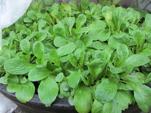 That’s mostly Mache, with some iffy-looking Romaine in the middle and small Cilantro plants in the back.