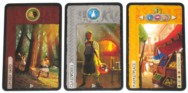 The Concept: 7 Wonders is centered around Card Drafting. What that means is that each player starts with a hand of seven cards, selects one to become part of their civilization, and passes the remaining cards to the player on their left. Rinse, repeat. Many of the cards have a cost (in wood/ clay/ gold, etc.) that needs to be met in order to buy them. The strategy is to purchase cards that help you advance your civilization the most and deny cards that help your neighbors.