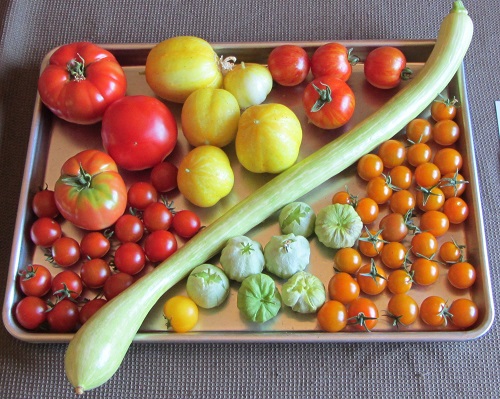 Wednesday — (L-R) Two Tromboncino, Sun Gold tomatoes, Sweet Million tomatoes, tomatillos, a Lemon cucumber, Tigerella tomatoes: