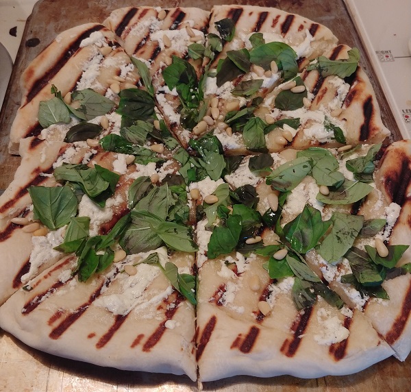 Both sides were brushed with a little olive oil then it was grilled on the first side for around 3-4 minutes. It was then removed from the grill, flipped it over, topped with the cheese/olive oil mash and returned to the grill for another 3-4 minutes. After it came off of the grill it was topped with the basil and pine nuts. I think we might have added a drizzle of balsamic after this picture was taken.