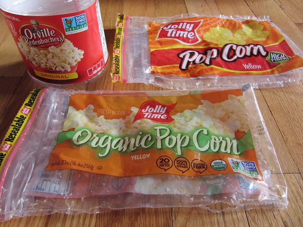 As for the popcorn — we really hadn’t been eating popcorn prior to this year. I know this because the bag in the pantry was dated “Best By 08/08/2013.” It still popped fine. That’s the bag on the top right: