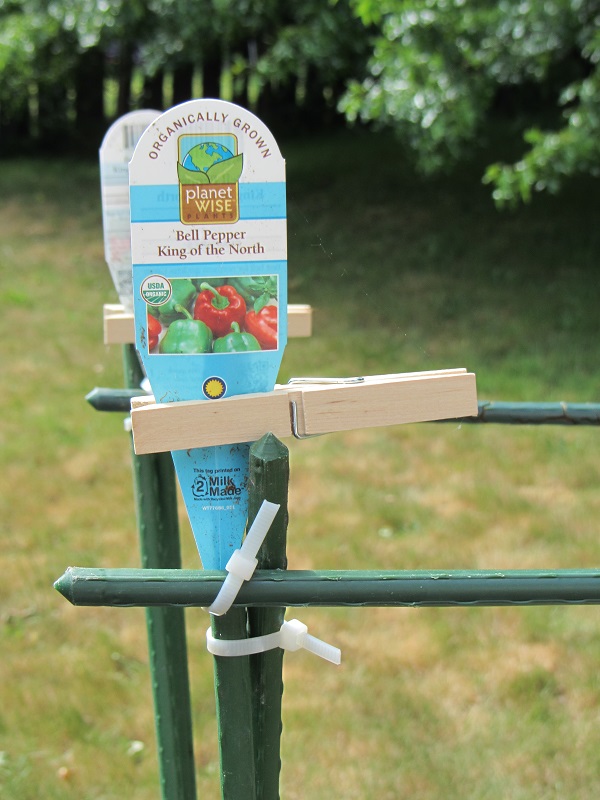 We use clothes pins to hold the plant labels. This is also a good close-up of the tops of the “X” and how it’s all tied together: