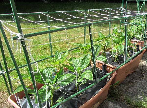 I’m hoping this is a more stable answer than putting the stakes directly into the boxes — almost every year at least one pepper box has toppled over on a windy day when the plants are heavy with fruit.