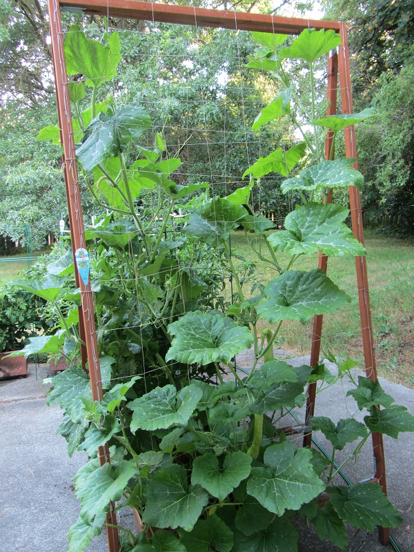 The Tromboncino receive direct sunlight starting about 1pm through most of the rest of the day. They’re in the “back” of the garden, which is the last place that the sun reaches as it moves over the house. We have a couple of fruits on the plant that are getting some size. For reference, the trellis squares are 7 or 8″. The fruits will grow to 24″ or a little more: