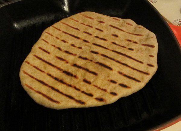 Combine 300 grams AP flour, 185 grams room temperature water (65% hydration), 6 grams kosher salt (2% of the flour by weight), and 1 tsp instant yeast in a stand mixer. Knead on low speed for 8 minutes. Cover and let rest 1 hour. Divide the dough into 3 balls, cover, and let rest another 30 minutes. Heat a skillet over medium high heat. Stretch the doughs out into loose rounds 6-8″ across. Brush each side of the discs lightly with olive oil, and cook 2-4 minutes per side until done and browned to taste. Wrap the finished breads in a clean kitchen towel to keep warm.