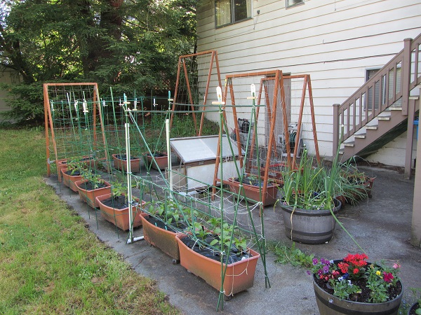 Back Row, from left: The large A-frame trellis with “Green” Tomatillos (2 plants) and Tromboncino Zucchini (2 plants). On the far right not visible is a box of scallions.