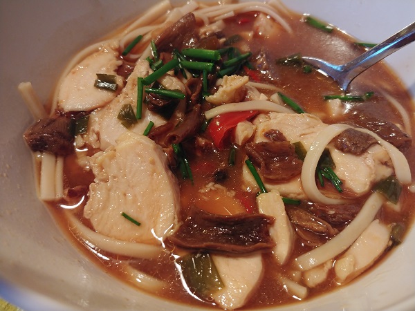 5 minutes before serving set the heat to very low/off. Add the Chicken, Noodles, and Miso to heat through.