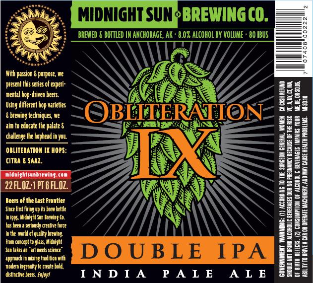 Despite being spendy, I really do like to indulge in Midnight Sun beers when I can get them. They honestly make some of the more underrated beers out on the market and they aren’t always readily available. The chance to pick up a double IPA, Obliteration IX, was a nice treat, even if the 22 oz. bottle did set me back almost $13. It clocks in at 80IBU and 8% ABV. Was it worth it?
