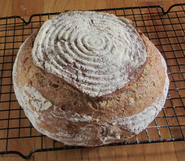 The dough was smooth and handled well after the 8am coil fold so I moved it to a covered banneton. At 9am I preheated the oven and our Le Creuset bread oven to 460F. At 10am the dough went onto a parchment and was slashed, then moved over to the bread oven. I reduced the temperature to 450F and baked the dough for 20 minutes covered, then 22 minutes uncovered. (The same time and process that I use for No Knead bread, though most times I’ll just go directly into the Le Creuset or a dutch oven rather than starting on parchment.) Cool on a baking rack.