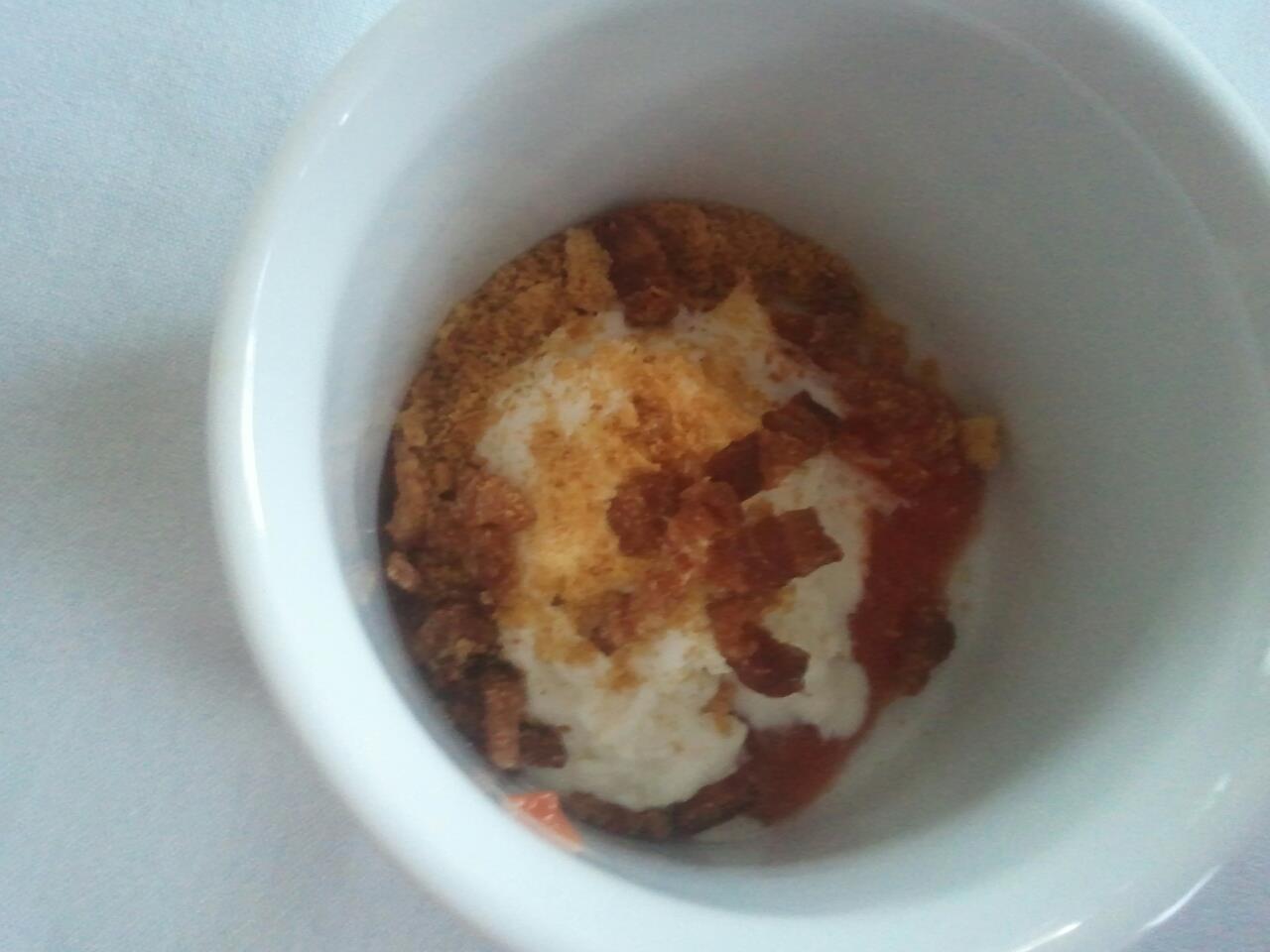 In a ramekin, take a tablespoon of the tomato compote and put it in the bottom. Add one scoop of the ice cream and top with the brioche crumble and bacon lardons. Serve to an unsuspecting public.