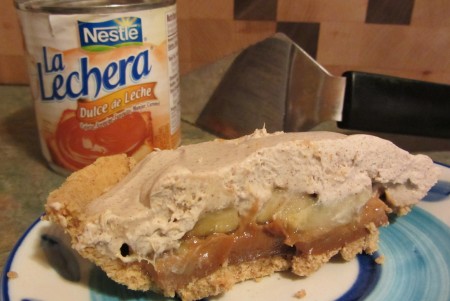 Recipe here. [Food Network, Marcella Valladolid: Dulce de Leche Banana Cream Pie Recipe] Annie substitutes a pre-made graham cracker crust. The Nestle La Lechera Dulce de Leche should be available in the Mexican section of any large supermarket.