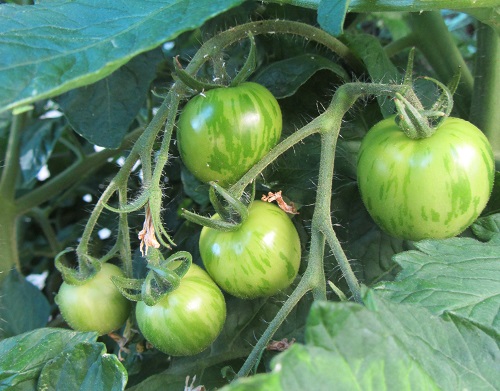 It seems to me that the great majority of the mold on the tomato plants occurs on the “side shoots” — the leaf-only branches that are at a 90 degree angle to the main stem. The “sucker” branches (that come out of the side shoot/main stem intersection, and grow additional fruit), and the main stems are almost entirely mold free. This is true regardless of the location “side shoot”. The mold is both on exterior, well ventilated side shoots and on leaves that are buried in the interior of the leaf canopy. It’s like the plant figures that if it’s not a fruit producing node then it’s now time to shut down those natural defenses and spend that energy somewhere else.