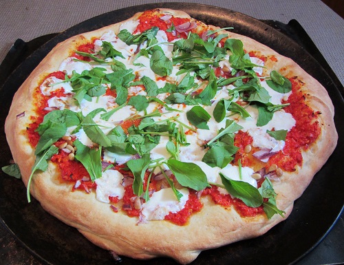 One more picture — a quick weeknight pizza with roasted red pepper sauce (peppers from the garden), mozzarella, and arugula (from the salad table):