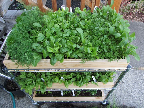 The harvest barely put a dent in the plant mass (Top shelf, L-R: “Little Gem” romaine, dill, spinach, “Jericho” romaine, cilantro, arugula) Behind the greens are the stairs to the front door — the salad table couldn’t be more conveniently located:
