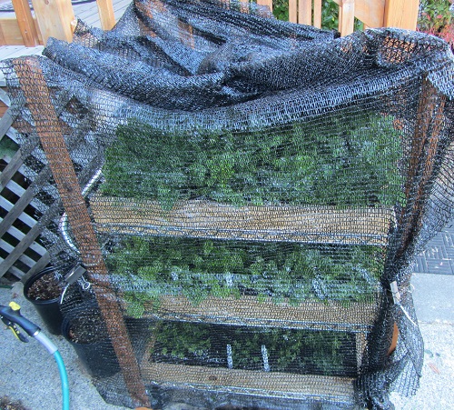 It’s supposed to get into the low 80’s the next couple of days. The salad table only gets sun until about 1pm, but I’m still concerned that something may decide to bolt and destroy part of the “work” we’ve put in. I’m hoping that the shade cloth will help discourage that: