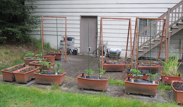 Our patio container garden had a “solid” year all-around: 173.1 pounds of produce from 9 EarthBoxes. Which comes to about 6 pounds per square foot of container space. The trees in and around the garden continue to expand, at some point soon we may need to go to fewer boxes and smaller (determinate) plants.