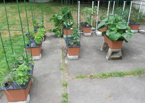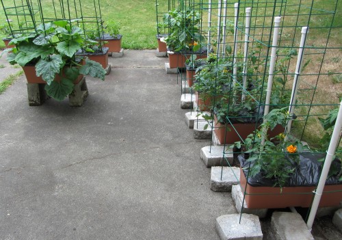 So far the Tomatillo and Tromboncino are sharing the trellis nicely — The Tomatillo are in the center and the Tromboncino have been trained up the sides. I’m hopeful that by removing browning Tromboncino leaves towards the middle and bottom as they arrive it’ll leave enough light and space for all four plants.